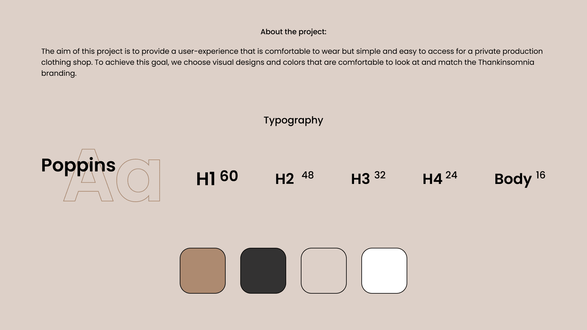 The aim of this project is to provide a user-experience that is comfortable to wear but simple and easy to access for a private production clothing shop. To achieve this goal, we choose visual designs and colors that are comfortable to look at and match the Thankinsomnia branding.